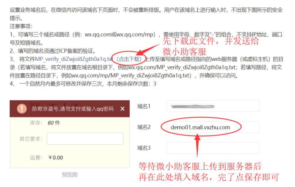 第2步:点击业务域名设置后,在弹出框中先下载验证文件,然后联系微小助客服,如下图: